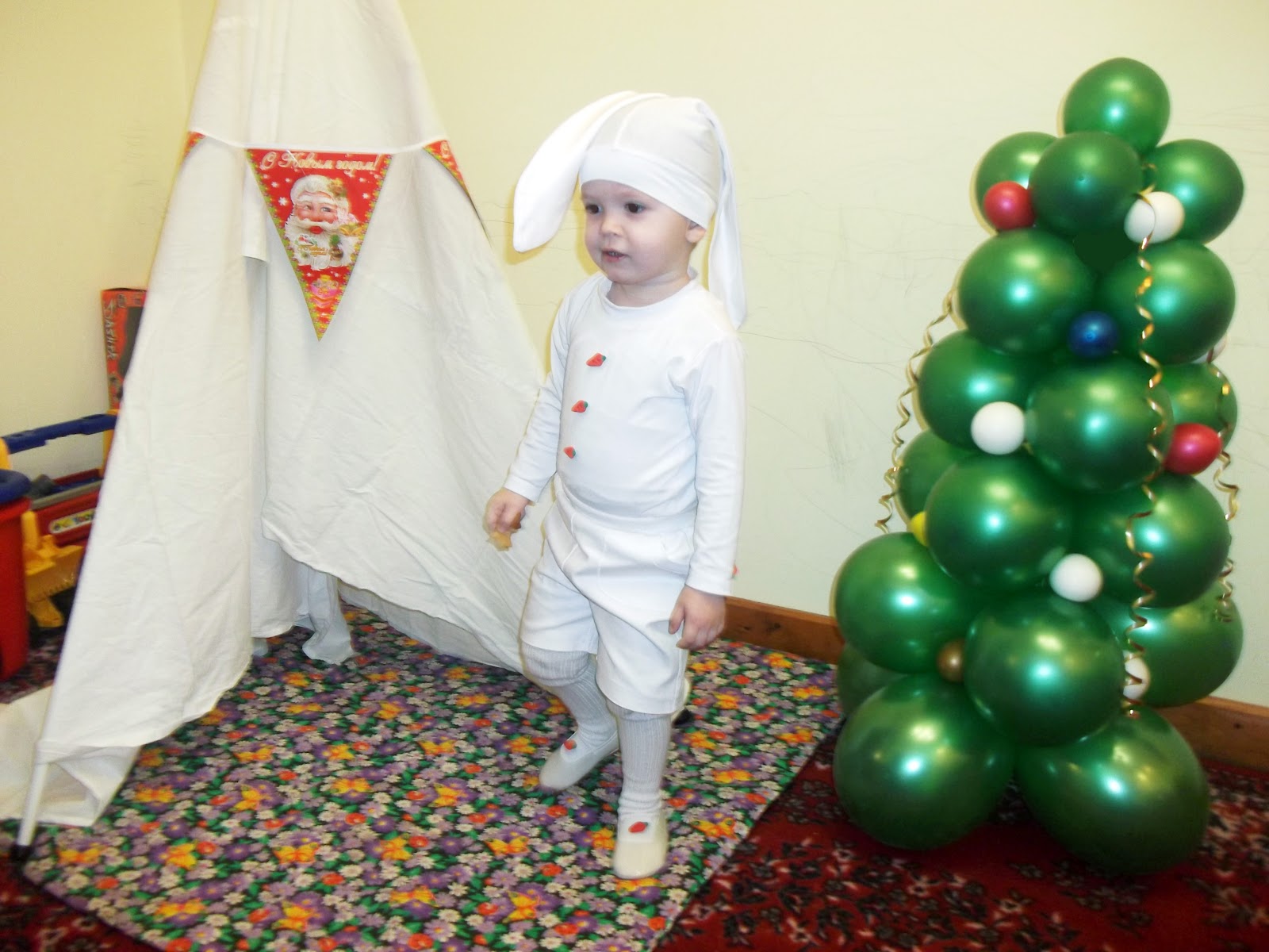 Прошу прощения за помятую ткань на шалаше, идея пришла неожиданно во время игры и было не до глажки. Уши у зайца теребятся постоянно, поэтому торчат всегда в разные стороны. Ёлочку из шаров сделали специально для Сашиных игр (иначе он норовил утащить наряженную ёлку) и для хороводов, которые он очень полюбил.